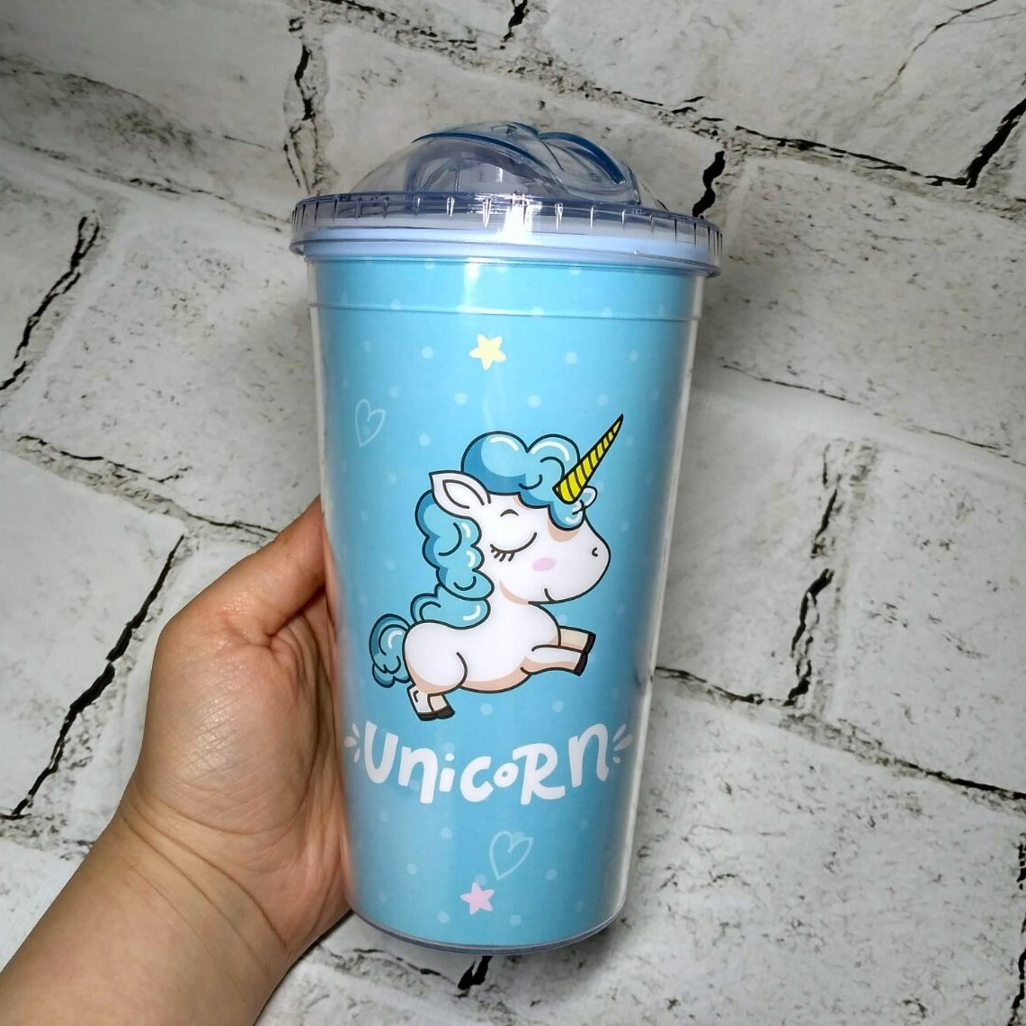 Акрилова склянка дитяча. Склянка з кришкою і трубочкою, з принтом "Єдиноріг".